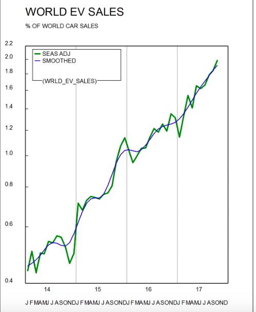 In 2017, EV’s constituted over 2% of global EV sales: this is only 18 months after they breached the psychologically and economically important 1% sales barrier in Q1 2016.